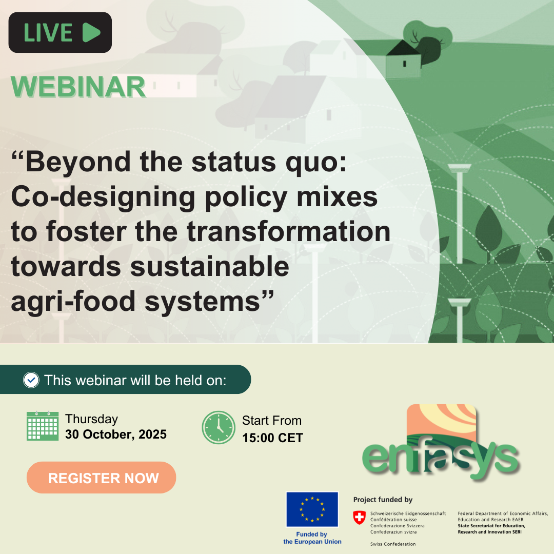 Beyond the status quo: Co-designing policy mixes to foster the transformation towards sustainable agri-food systems 🗓 Thursday, 30 October 2025🕒 15:00 – 16:00 CET📍 Online How can policies